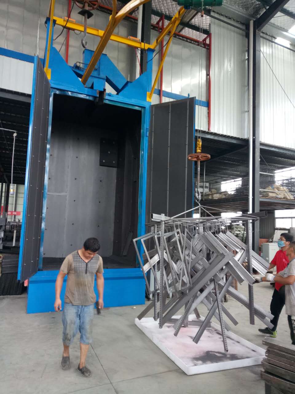 吊鉤式拋丸清理機適用于不同的生產多品種工件的表面清理,同時能解決各種規格工件的輸送問題,DISA拋丸機室體密封技術目前在行業處于 水平,為工件表面 經濟的拋丸清理提供了完整的解決方案。拋頭位置 的設計,工件的表面甚至凹陷的表面再一次通過中被清理干凈,正對丸料流的室體表面易于磨損,用高錳板或的工具鋼作為襯板,易于 換,吊鉤輸送系統,丸料循環系統,重載拋頭,拋丸室體-焊接結構,型鋼加強。